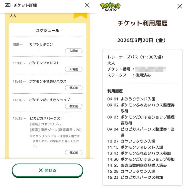左が前編で多くを語ったよみうりランド入場後の整理券取得の直後、右がこの日の最終的な利用履歴=行動履歴です。